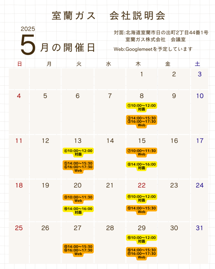 5月の会社説明会のスケジュールをご案内いたします。